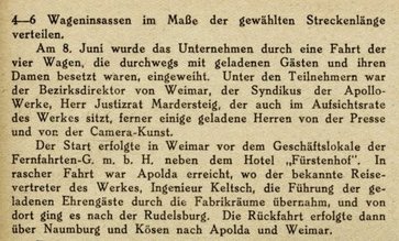| Die Expansion der Apollo-Werke A.G. im Jahr 1921 In den Jahren 1920 und 1921 arbeiteten die Apollo-Werke an der absoluten Kapazitätsgrenze. Eine Erweiterung des Werkes in Apolda war nicht mehr möglich oder erwünscht (die Stadt Apolda ist bis heute wenig angetan von der ehemaligen Automobil-Fertigung, mal gelinde formuliert). Die erforderliche Betriebserweiterung erfolgte durch den Ankauf der insolventen Markranstädter Automobil Fabrik (M.A.F.), dort wurde ab 1921 der kleine Apollo 4/14, 4/16 bzw. 4/20 (vor dem Krieg Typ B) hergestellt. Genauere Unterlagen, wann und wie der Erwerb und die Übernahme erfolgten, konnte ich nicht finden. 1922 jedenfalls stehen noch ca. 350t Reichsmark an Hypothek für Werk-II in den Bilanzen. Die Apollo-Werke firmierten zeitweise als "Apollo Automobil- und Flugzeug-Werke A.G. zu Apolda i. Thür.", leider habe ich nie Unterlagen über eine Flugzeug-Fertigung daselbst entdeckt. Markranstädt ist eine Kleinstadt in Sachsen westlich von Leipzig. Hier ist man stolz auf die "automobile Vergangenheit", wenn auch weder in Wikipedia noch auf der Homepage von Markranstädt darauf hingeweisen wird. Noch nicht mal auf den Oldtimer Verein wird verlinkt. Die Homepage des Oldtimer Vereins ist etwas unübersichtlich gestaltet und informiert kaum über die Geschichte von MAF. Deutlich mehr mehr erfährt man auf den privaten Web-Seiten von ZWENKE. Auch das Markranstädter Heimatmuseum mit prohibitiven Öffnungszeiten scheint keinerlei Ausstellung zur örtlichen Automobilhistorie zu besitzen und bietet Online überhaupt keinerlei Information. |