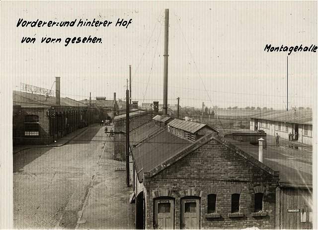 | Oben Ansicht der Schmiede (Eckgebäude) und Ansichten der Innengebäude, Lackiererei, Tischlerei, Auto- und Montage-Halle, Dreherei, Fräserei, Werkzeugbau und den Büros (Archiv Fam. Slevogt). Fantasie-Begabte können gern versuchen, die Gebäude in dem Lageplan bzw. in der Luftaufnahme zuzuorden. | ||||||