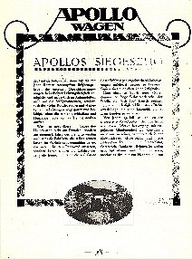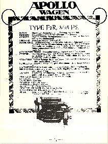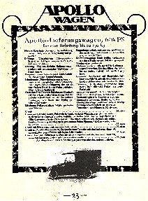 Den obigen Katalog hätte ich gerne gezeigt, er wurde 2006 für 160.- € versteigert. Er enthält Apollo-A 2-Zyl. 4/7 PS Luftgekühlt, Apollo B 4-Zyl. 4/10 PS, Apollo-C 6/18 PS, Apollo-G 7/20 PS, Apollo-D 10/30 PS, Apollo-E 6(14 PS Luftgekühlt. Insgesamz 16 Seiten. |