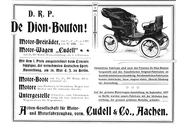 "Cudell und Co. in Aachen hatte zwei Motordreiräder ihres neuesten 1898/99-Modells, einen Anhängepersonenwagen, einen Anhängegepäckwagen, ein Motorboot und ihre Dreiradmotoren System Dion und Bouton ausgestellt. Der geringen Entfernung wegen – 80 km – hatte die Firma Cudell und Co. die sämtlich genannten Ausstellungsgegenstände per Landstraße zur Ausstellung geschafft. Zu diesem Zwecke wurden der Anhängepersonenwagen und der Anhängelastwagen mit Motoren und Ausstellungsgegenständen befrachtet, hinter die Cudell'schen Motordreiräder gespannt und in etwa 3 Stunden von Aachen nach Düsseldorf gefahren. Ein Beweis für die Zugkraft dieses Motordreirades wurde dadurch an den Tag gelegt, dass das etwa 6 m lange und 1½ m breite Motorboot, welches mit Zubehörtheilen und Befrachtung über 300 k wiegt, auf zwei gewöhnliche Dreiräder gepackt und mittels Motordreirades nach Düsseldorf transportirt wurde. Die Fahrt wurde ohne Unfall in etwa 3½ Stunden ausgeführt."