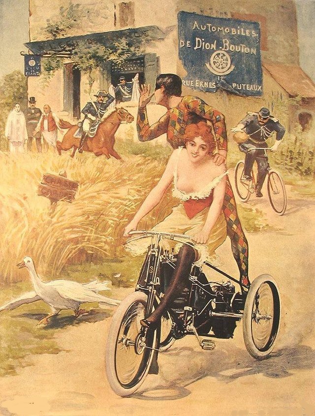 | de Dion - Bouton Werbeposter ca. 1903. Die farbige Werbung von De Dion war berühmt, daher unten noch zwei Plakate mit dem Dreirad. |