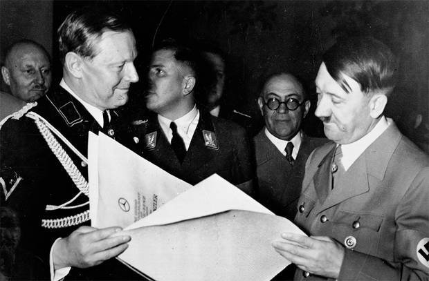 | Jakob Werlin überreicht 1940 eine Dank-Urkunde von Daimer-Benz an Adolf Hitler (Wikimedia) |