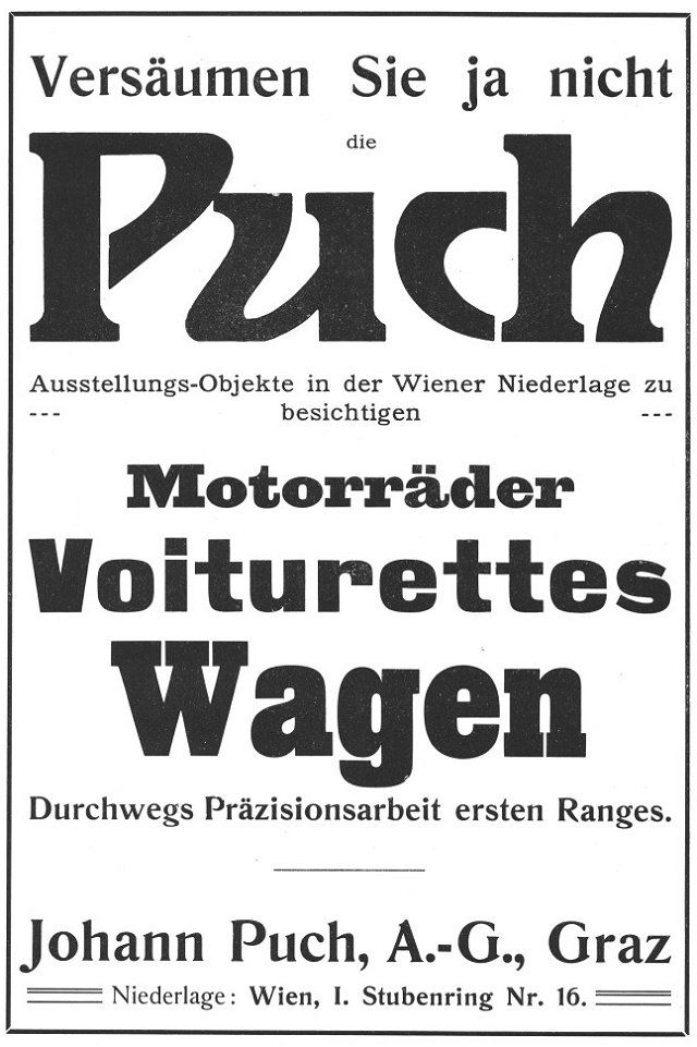 | Werbeanzeige aus der "Allgemeinen Automobil Zeitung" vom 19.April 1908 mit einem Leserbrief des Puch-Fahrers und Apothekers Loebel: Mit der mir von Ihnen gelieferten 8/10 HP Voiturette bin ich sehr zufrieden; sie hat mich im letzten Winter unter den schwierigsten Schneeverhältnissen bei meinen kleinen Touren nie im Stich gelassen. |